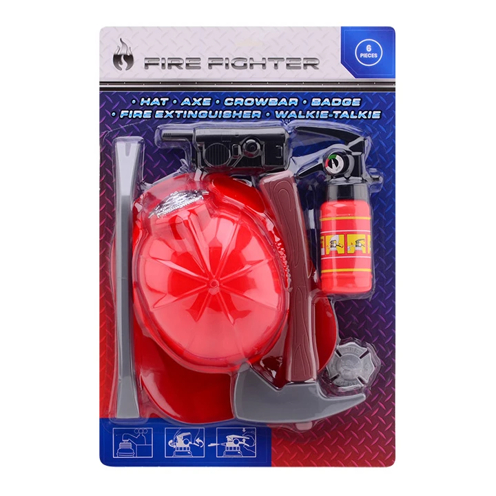 Brandweer speelset bestaande uit een helm, hamer en bijtel, brandblusser, batch en walkie-talkie.