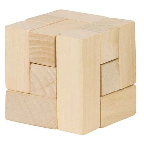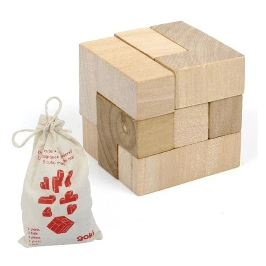 7-delige puzzel in katoenen zakje waarmee een kubus gemaakt kan worden? Niet zo makkelijk als het lijkt.