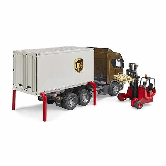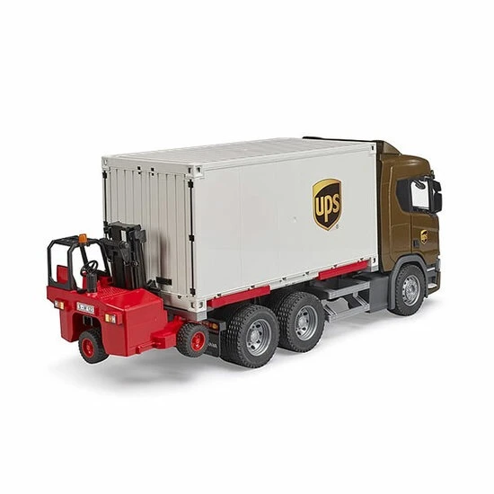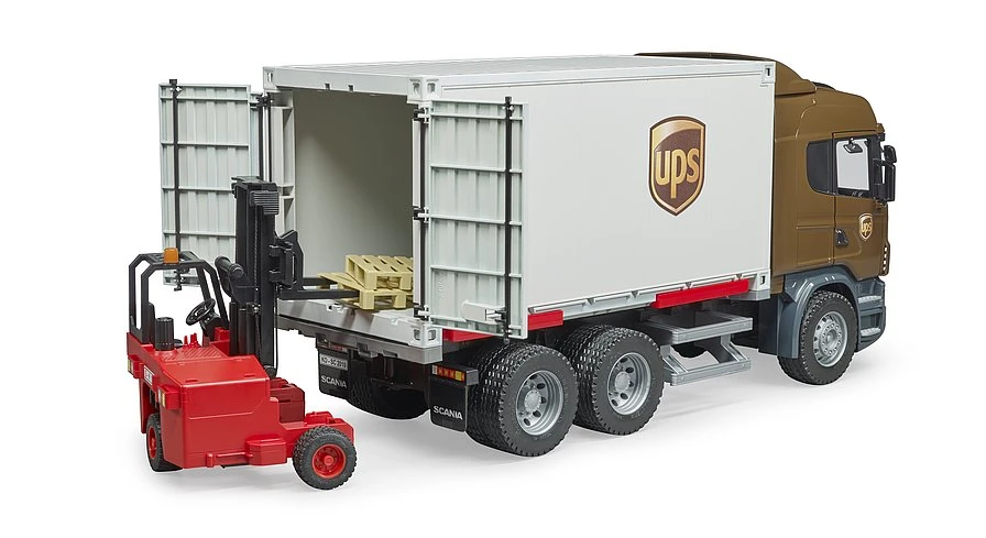 Scania R-serie UPS vrachtwagen met heftruck De UPS vrachtwagen is een miniatuur van een Scania R-serie transport vrachtwagen en is voorzien van een wissellaadbak met uitklapbare steunpoten. Nadat deze poten stabiel op de grond zijn gezet, kan de trekker onder de container vandaan rijden, op weg naar een nieuwe lading.