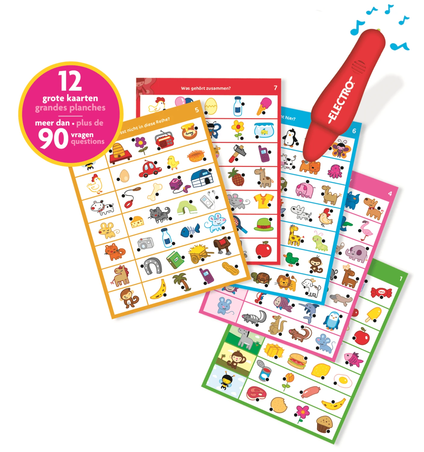 • 12 grote kaarten met meer dan 90 vragen