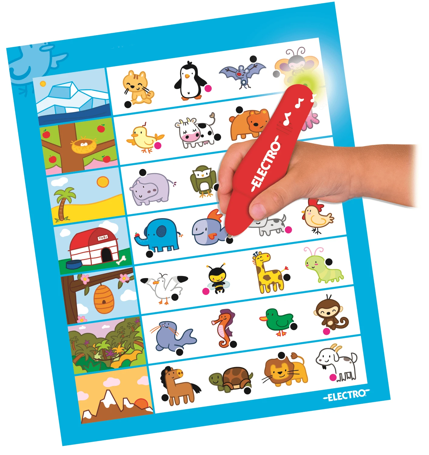 Met Electro Wonderpen dierenpret leerspel leer je alles over verschillende dieren. Vind het juiste antwoord op iedere vraag. Raak met de punt van de pen het antwoord aan. Als het antwoord goed is, hoor je een muziekje en gaat het lampje branden.
