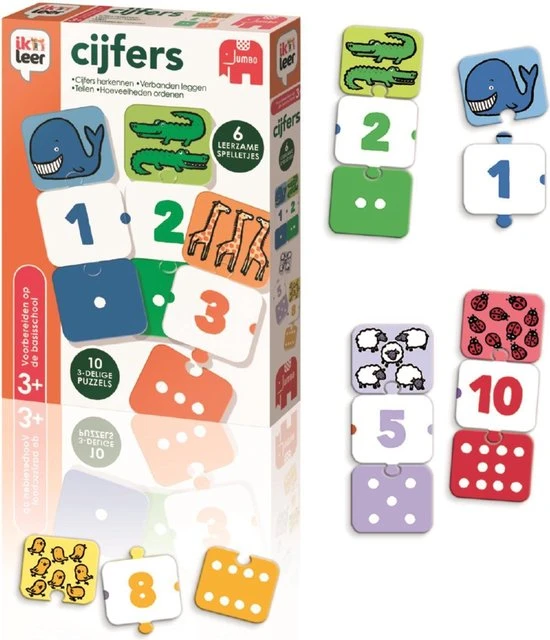 Met ‘Ik Leer Cijfers’ leren kinderen spelenderwijs cijfers herkennen, tellen, hoeveelheden ordenen en verbanden leggen. Leer met behulp van de 6 spelletjes tellen van 1 tot 10. Om alleen of samen mee te spelen. Leg de dierenreeks van klein naar groot. Zie jij hoeveel dieren er op de kaart staan? Puzzel dan het juiste getal eraan vast. De spelletjes lopen op in moeilijkheidsgraad en zijn zelfcorrigerend.
