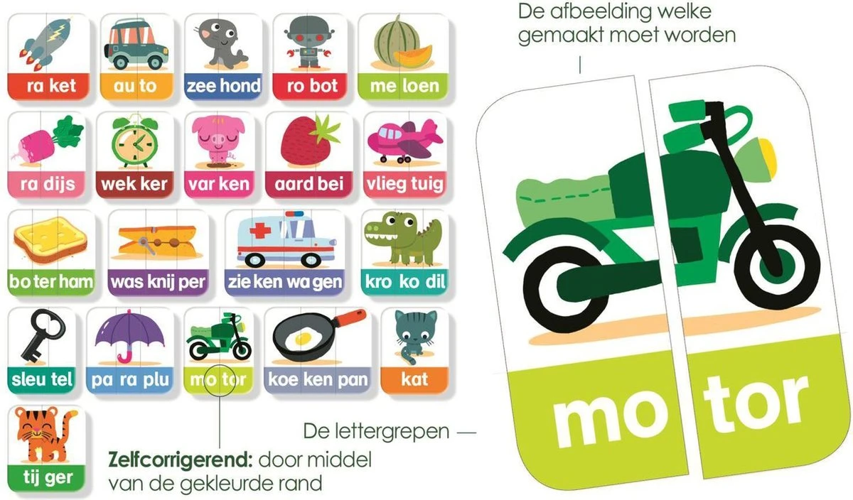 Met Ik Leer Lettergrepen leren kinderen spelenderwijs lettergrepen benoemen, woordjes vormen en de woordenschat vergroten. De woordjes zijn in 1, 2, 3 of 4 lettergrepen opgeknipt. Herken jij de klanken? Verbind de lettergrepen om zo een woord te vormen.