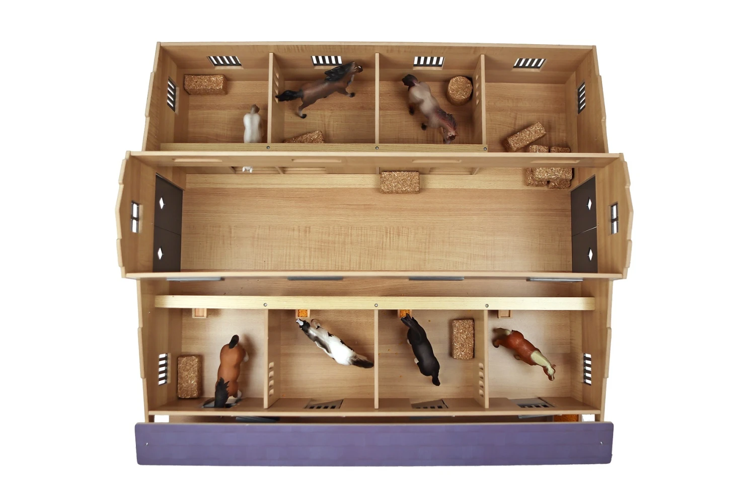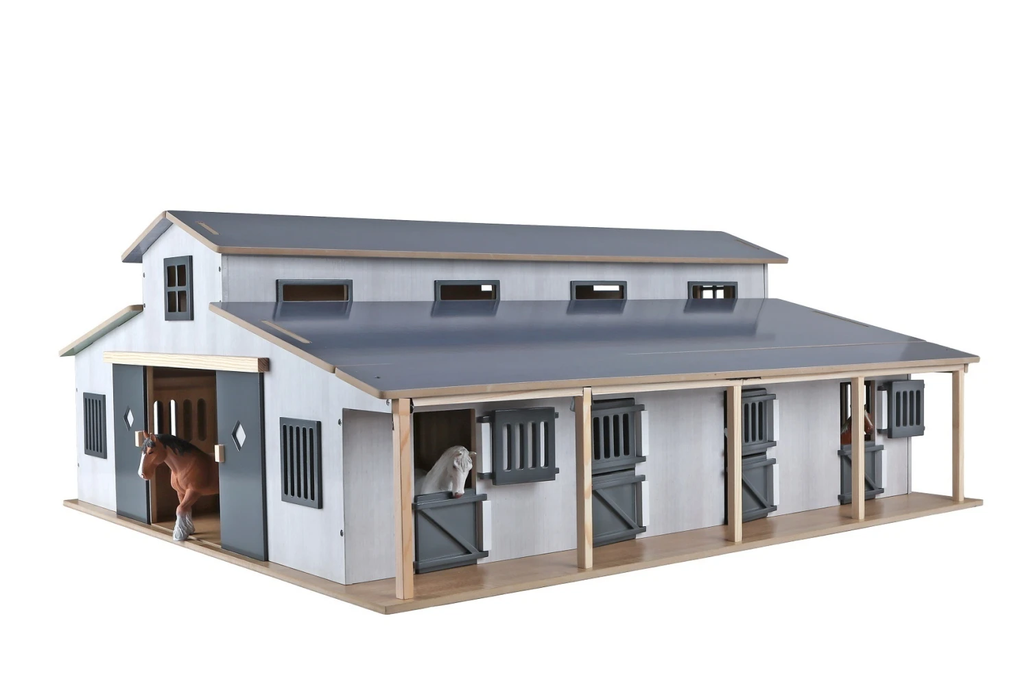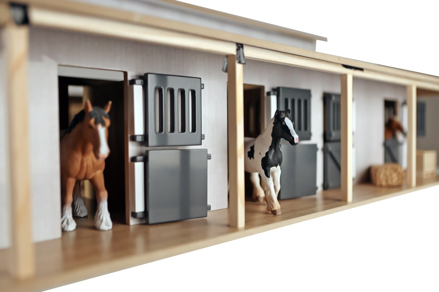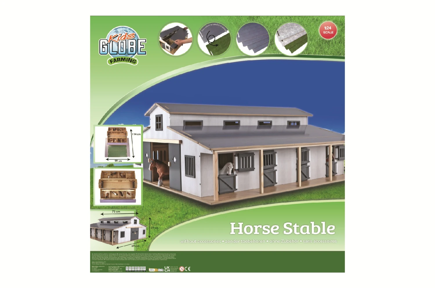 De loods heeft als schaal 1:24 en is daarmee uitstekend te combineren met SCHLEICH of BULLY paarden, of met paarden van andere merken met een formaat van 12 – 14 cm. (voertuigen worden er niet bijgeleverd).