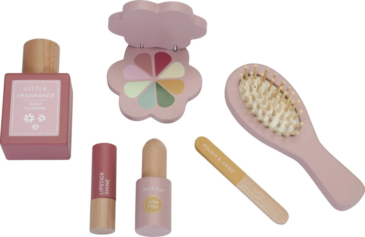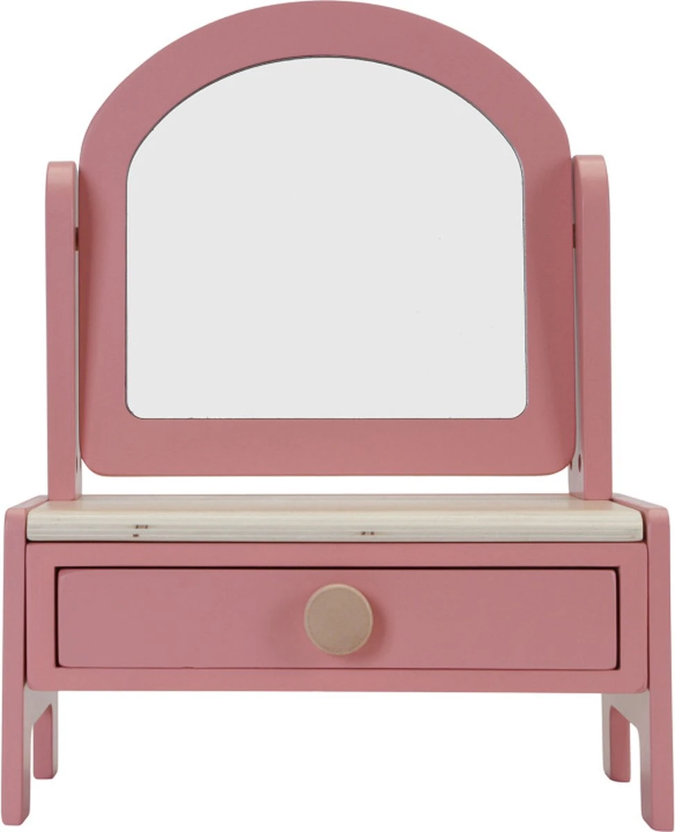 Spiegeltje, spiegeltje aan de wand. Deze roze houten kaptafel voor kinderen stimuleert fantasierijk spel en zorgt voor eindeloos veel speelplezier. De kaptafel beschikt over een draaiende spiegel en 6 houten schoonheidsproducten, zoals een haarborstel, lippenstift, parfum, oogschaduw, nagelvijl en nagellak. De kaptafel heeft ook een opberglade om haarbanden, elastiekjes en speldjes (niet inbegrepen) in te bewaren. Geschikt vanaf 3 jaar.