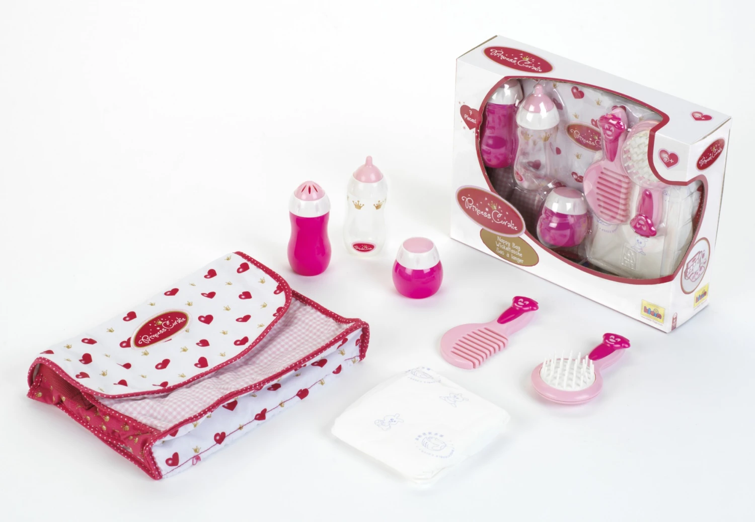 Deze tas bevat alles om je poppenbaby te verzorgen wanneer je onderweg bent. Luiertas compleet met flesje, luier, poederdoos, cremedoosje, borstel, kam.