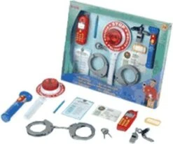 Halt, blijf staan! Dit is de politie! Jij bent de politieagent die voor rechtshandhaving en orde zorgt. Met deze Politieset van Theo Klein is dat allemaal mogelijk. De set bevat vele nuttige hulpmiddelen waarmee jij je eigen werk als wetshandhaver goed kunt uitvoeren. Legitimeren doe je jezelf met je legitimatiebewijs. En met je mobiele telefoon ben je altijd bereikbaar. Zo sla je misschien wel elke boef in de boeien! Deze set biedt enorm veel mogelijkheden!
