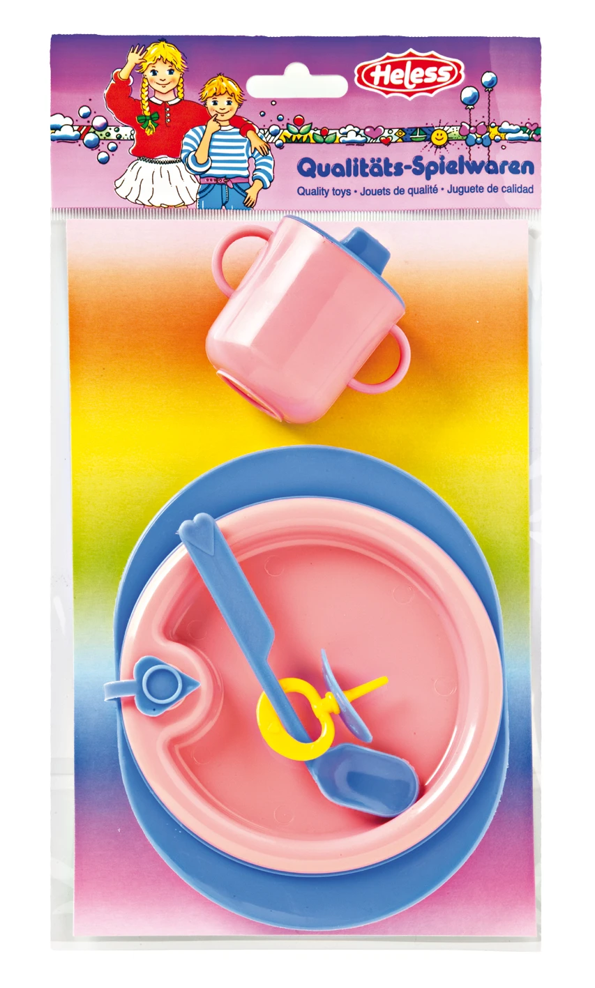 Poppenverzorgingsset bestaande uit warmhoudbord, lepel, speen en tuitbeker.