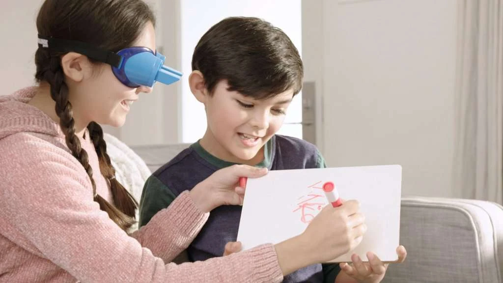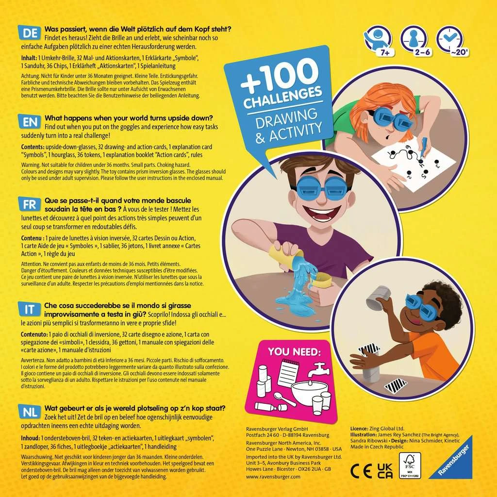 Wat gebeurt er als je wereld plotseling op z’n kop staat? Zoek het uit! Zet de bril op en beleef hoe ogenschijnlijk eenvoudige opdrachten ineens een echte uitdaging gaat worden. Inhoud: 1 ondersteboven bril, 32 teken- en actiekaarten, 1 uitlegkaart, zandloper, 36 fiches, uitlegboekje, actiekaarten en de handleiding.