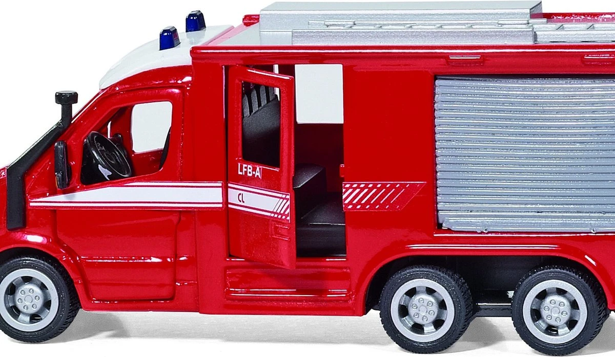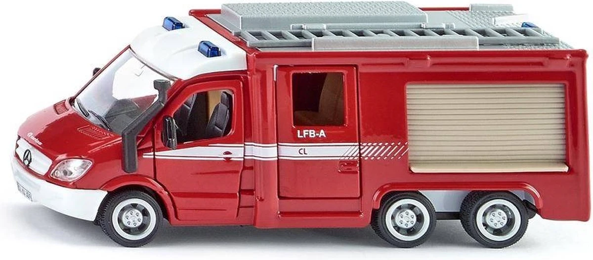 Dé brandweer-Sprinter voor elke klus. Met 3 assen en aandrijving op alle wielen zijn ook plaatsen in onherbergzaam terrein voor dit model geen probleem. Door de deuren van de bestuurders- en manschappencabine, die wijd open kunnen, kan men snel uitstappen. De nieuwe kleppen aan de zijkanten en aan de achterkant verdwijnen na het openen in de opbouw en bieden vrij zicht op de gedetailleerd uitgewerkte structuren. De ladder op het dak is afneembaar.