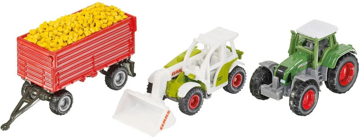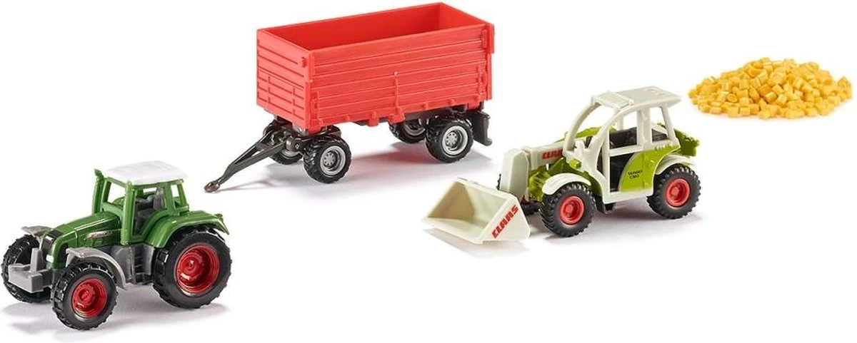 Giftset van Siku met twee tractors (Claas en Fendt), 4 wiel aanhanger en mais . Alle voertuigen zijn in de schaal van 1:87 en zitten samen in een mooie geschenkdoos.